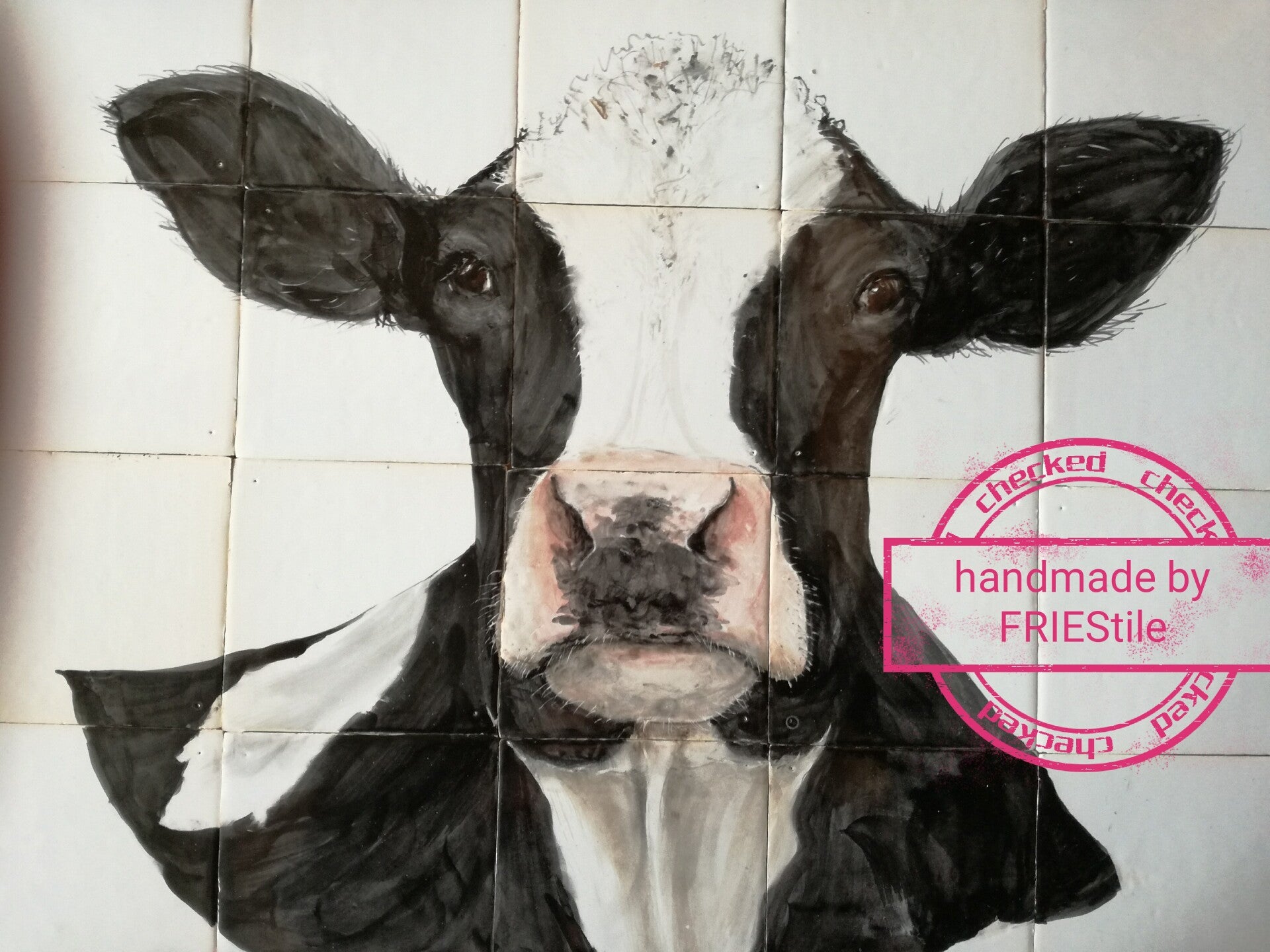 Ze kijkt je echt aan, koeienhoofd op 20 tegels.