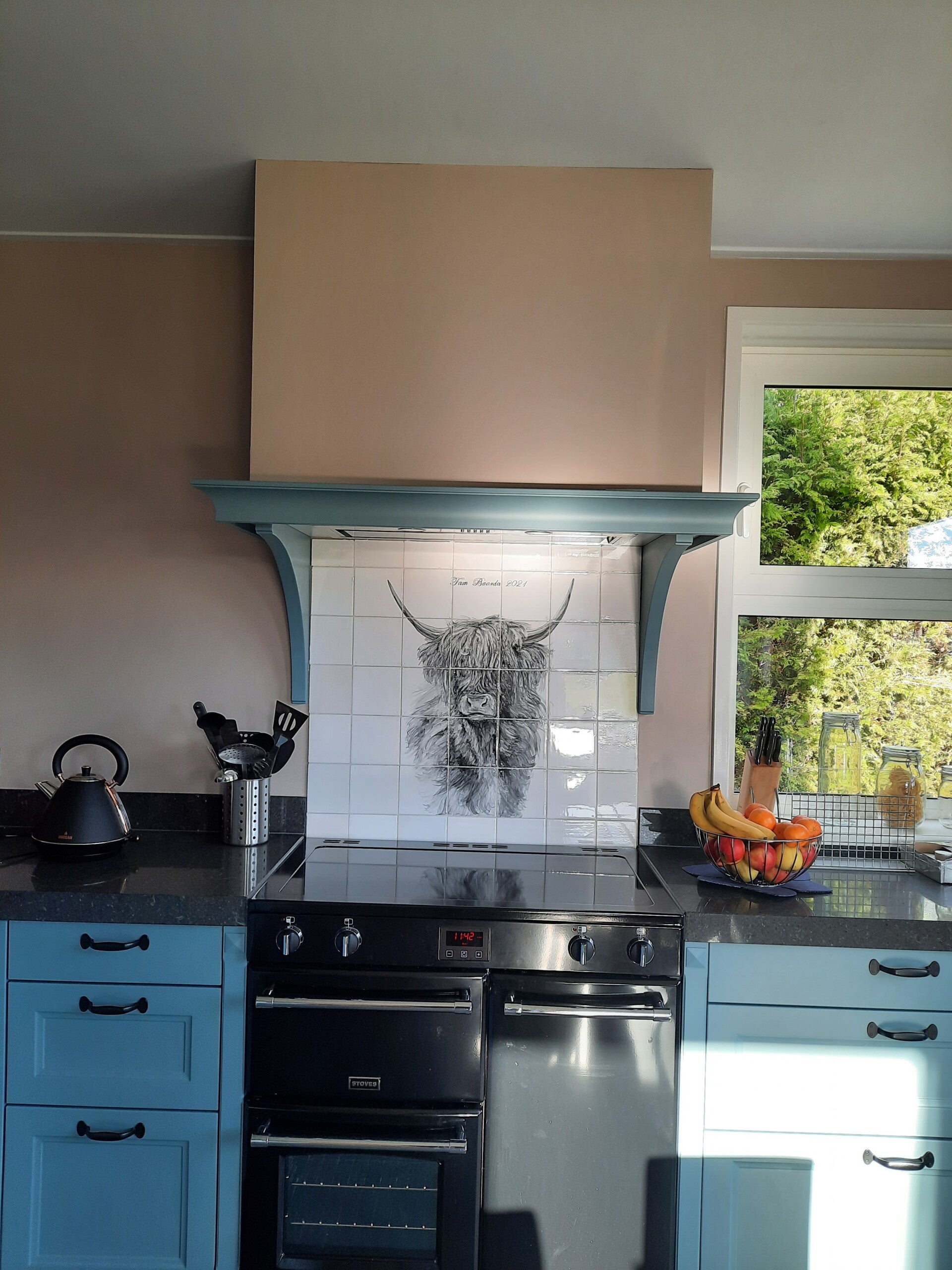Schotse hooglander op 25 witjes, in zwart, 65 x 65 cm.